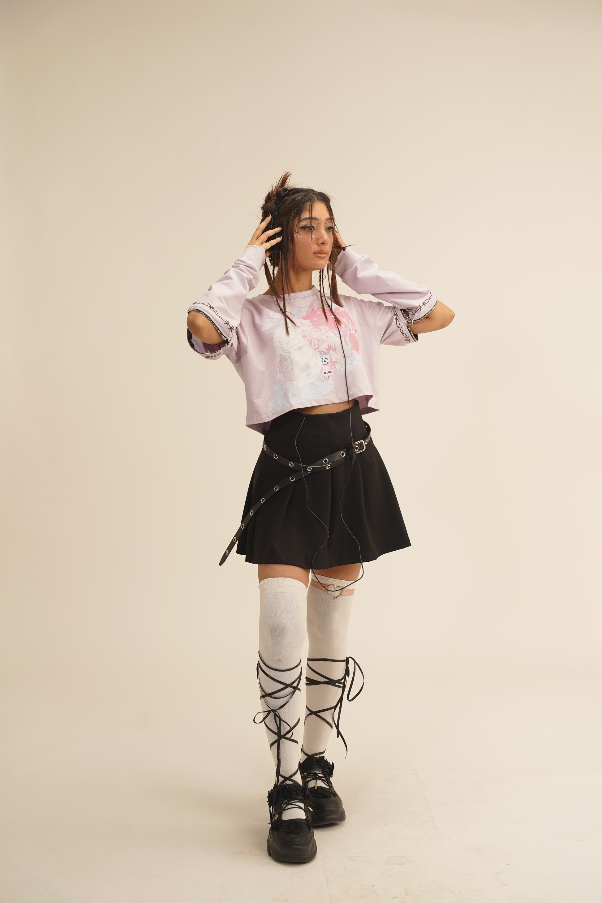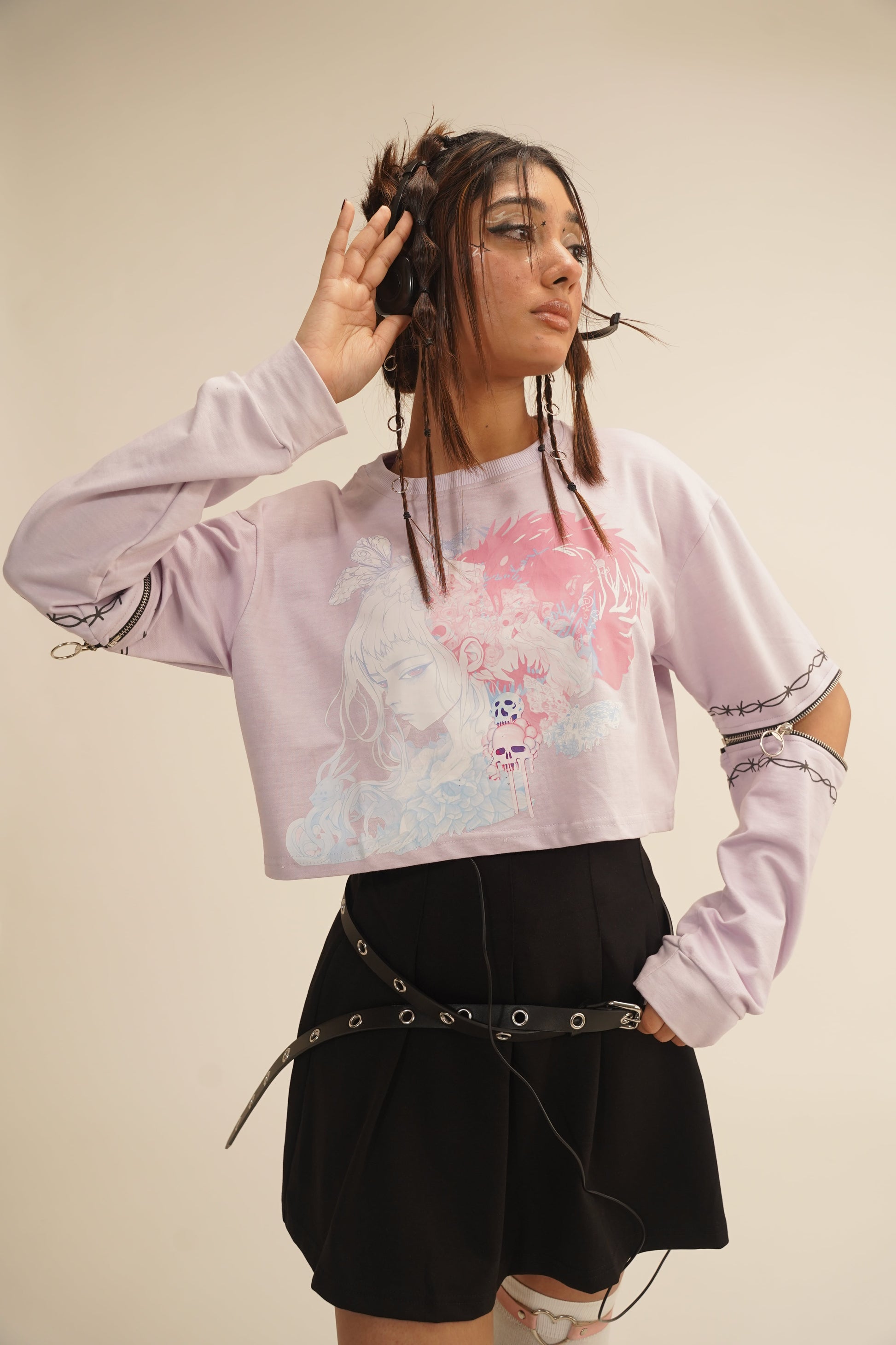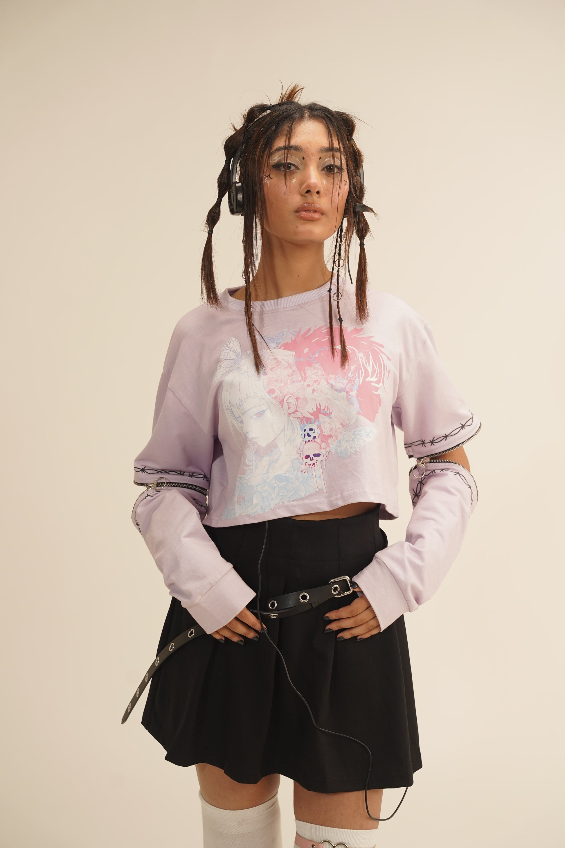 The Reboot Crop Sweatshirt showcases eye-catching anime-inspired graphics on the front. It includes a detachable sleeve with a zipper, allowing you to customize your look with ease.