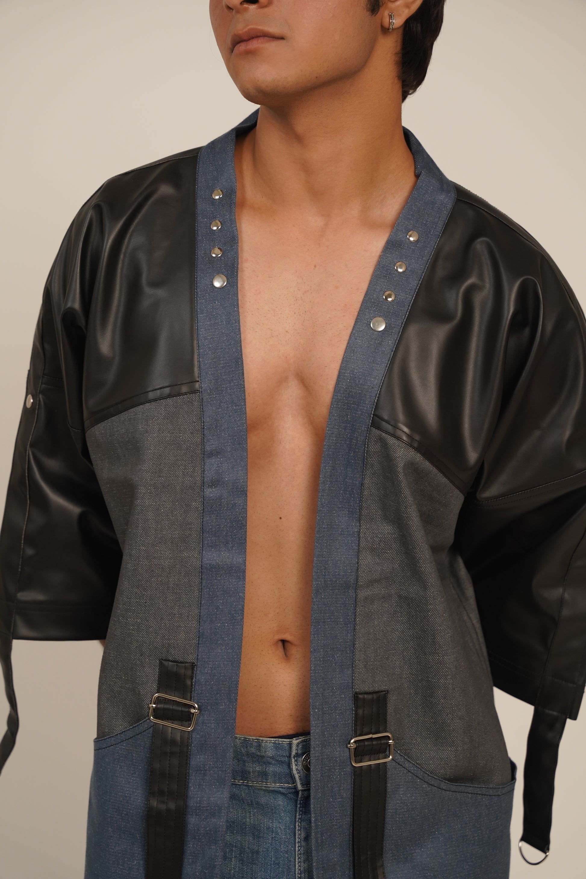 The Shogun’s Armor Kimono Shirt-Jacket merges power and precision. Made with a striking combination of black faux leather and blue and grey denim, it embodies the strength and resilience of Japan's legendary Shogun warriors. The bold leather panels create a fierce, modern silhouette, while the denim adds structure and style, offering a perfect blend of streetwear edge and traditional influence.